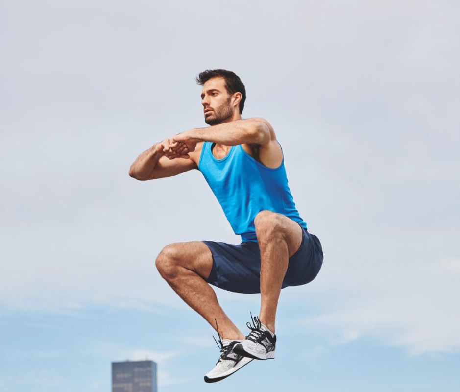 - Press through heels and drive up, pulling knees toward chest at the top of the jump and landing softly to start, then repeat.